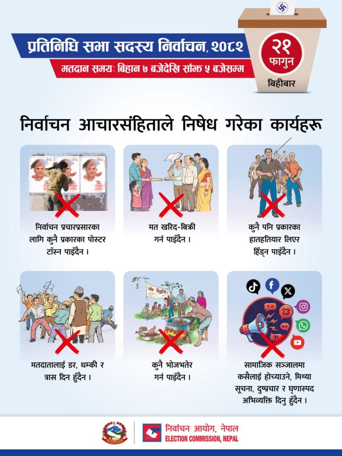 कर्मचारी र शिक्षकका ट्रेड युनियनका प्रतिनिधिहरुसंग छलफल गरेर कडाइका साथ आचारसंहिता पालना गर्न गराउन सहयोग मागिएको छ । पदीय जिम्मेवारी र आचारणविपरित कहिकतै प्रचारप्रसारमा संलग्नता देखिए सम्बन्धित कर्मचारी र शिक्षकमाथि कारवाही हुने जानकारी दिइएको दाहालले बताउनुभयो ।