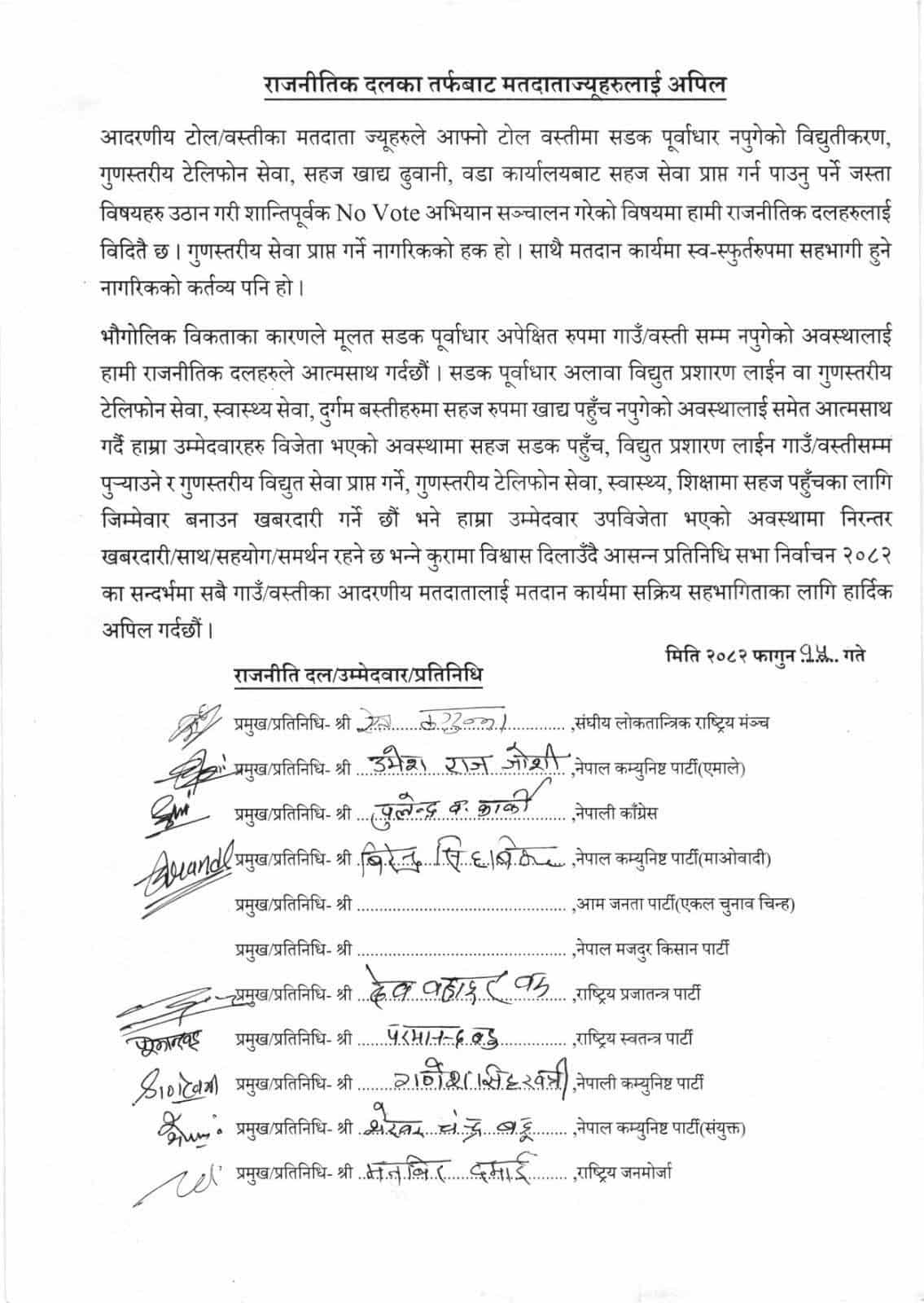 आफ्नो टोल–वस्तीमा सडक पूर्वाधार लगायतको विषयहरु उठान गरी नो भोट अभियान सञ्चालन गरेको विषय आफुलाई जानकारी रहेको दलहरुको अपिलमा उल्लेख छ । मतदानमा सहभागी हुनु नागरिकको कर्तव्य भएको स्मरण पनि गराइएको छ ।